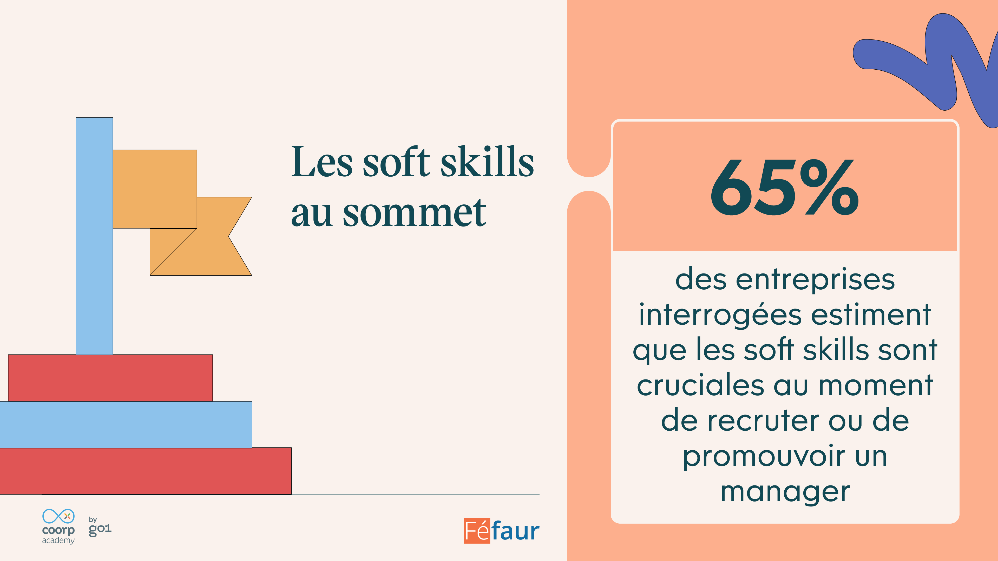 Dans une enquête récente menée conjointement par Coorpacademy by Go1 et Féfaur auprès de plus de 250 directions Learning & Development d’entreprises françaises, 65 % des interrogés estiment que les soft skills sont absolument incontournables lorsqu’il s’agit de recruter ou de promouvoir un manager.