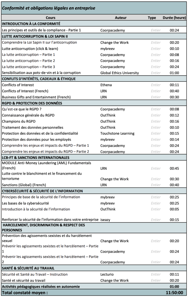 À travers une sélection structurée de modules, l’apprenant découvrira les bonnes pratiques pour prévenir les risques, protéger l’entreprise et adopter un comportement éthique conforme aux attentes règlementaires. Un parcours complet pour maîtriser les fondamentaux de la conformité et garantir une conduite professionnelle irréprochable.
